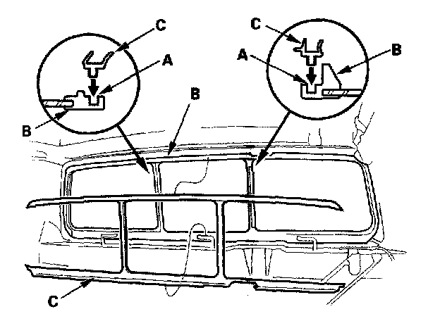 6. Apply a light coat of primer to the groove areas (A) of the rear window molding (B). Install the glass run channel (C) to the top and bottom groove areas of the molding, and then attach the glass run channel to the middle glass areas of the molding with adhesive (3M DP8005).