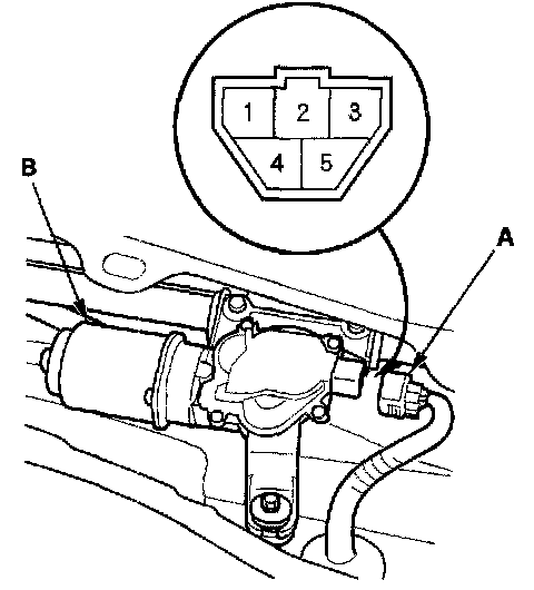 3. Disconnect the 5P connector (A) from the wiper motor (B).