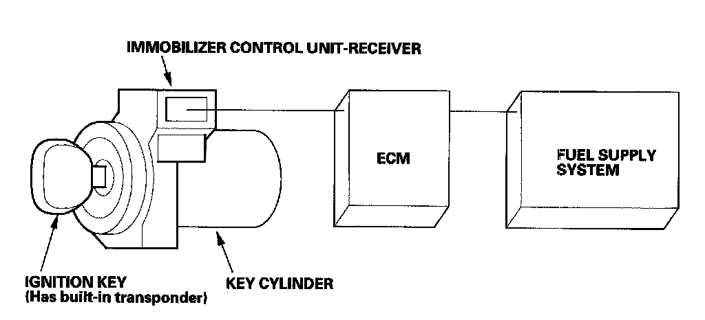 When the key is inserted in the ignition switch and turned to the on (II) position, the immobilizer control unit-receiver sends power to the transponder in the ignition key. The transponder then sends a coded signal back to the immobilizer control unit-receiver, which then sends a coded signal to the ECM. The code is a rolling type embedded in the immobilizer control unit-receiver instead of the ECM.