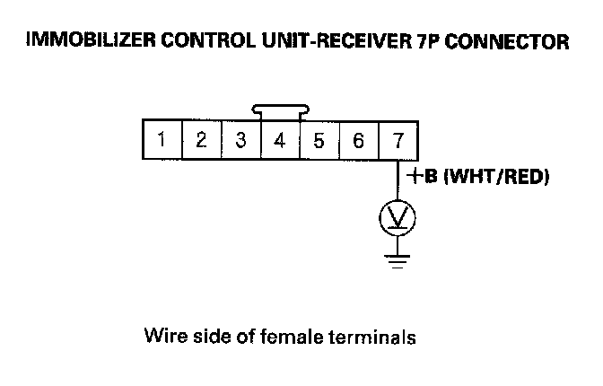 15. Check for voltage between the immobilizer control unit-receiver 7P connector No. 7 (+B) terminal and body ground.