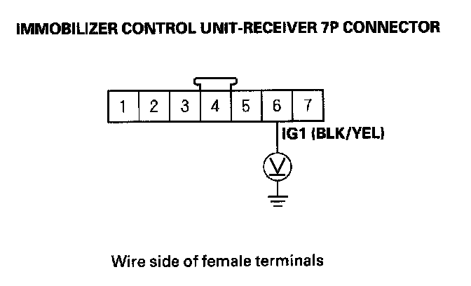 22. Check for voltage between the immobilizer control unit-receiver 7P connector No. 6 (IG1) terminal and body ground.