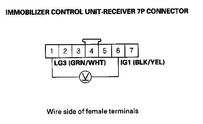 23. Check for voltage between the immobilizer control unit-receiver 7P connector No. 1 (LG3) and No. 6 (IG1) terminals.