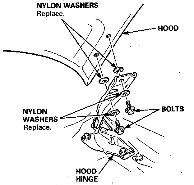 hood mounting bolts are special "Dacro" type bolts, when replacing, use only the same type of bolts.