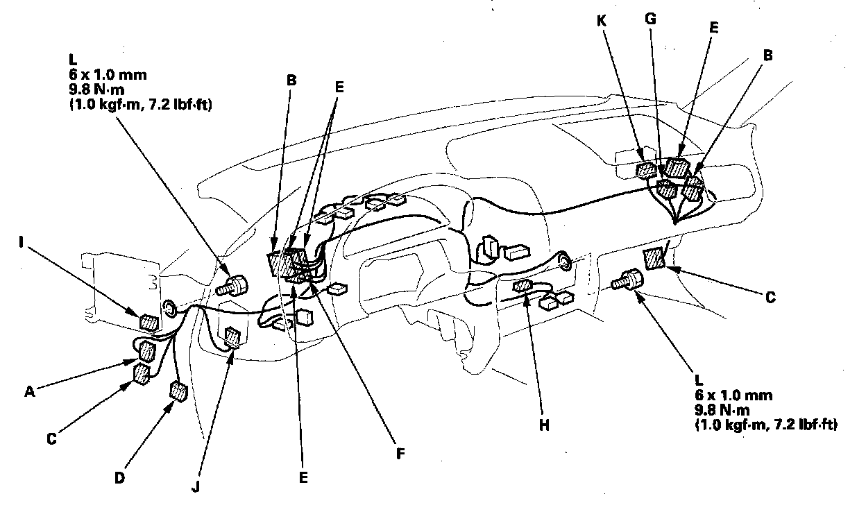 4. Disconnect the engine wire harness connector (A), engine compartment wire harness connectors (B), door wire harness connectors (C), rear wire harness connector (D), steering hanger beam wire harness connectors (E), SRS main harness connector (F), front impact sensor harness connector (G), radio antenna harness connector (H), ECM connector (I), keyless entry control unit connector (J), and convertible top control unit connector (K).