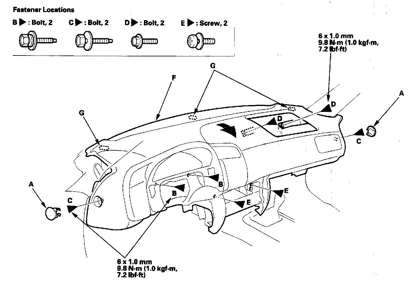 7. Open the doors, remove the caps (A), then remove the bolts (B, C, D) and screws (E), and lift up on the dashboard (F) to release it from the guide pins (G). Take care not to scratch the center console and shift knob.
