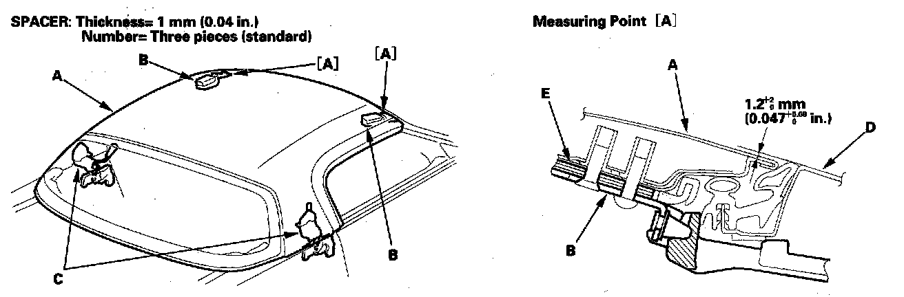 6. Lock the roof (A) securely with both lock handles (B) and roof side locks (C). Check the level difference between the roof and body (D) at the measuring point [A] . If the difference is not within specification, remove the roof from the body, and adjust the difference with the spacers (E) that are installed between the lock handle and the roof.