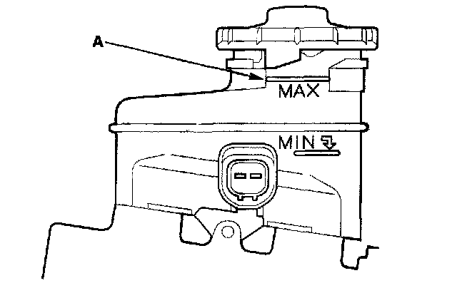 1. Make sure the brake fluid level in the reservoir is at the MAX (upper) level line (A).