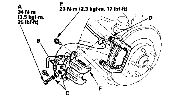 9. Hold the caliper pin (D) with a wrench, being careful not to damage the pin boot. Remove the two caliper bolts (E) with another wrench, and remove the caliper (F) from the bracket.
