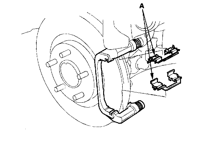 5. Using vernier calipers, measure the thickness of each brake pad lining. The measurement does not include the brake pad backing plate (A) thickness.
