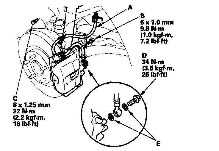 6. Install the brake hose (A) on the knuckle and damper bracket with two 6 mm flange bolts (B) and the 8 mm flange bolt (C) first, then connect the brake hose to the caliper with the banjo bolt (D) and new sealing washers (E).