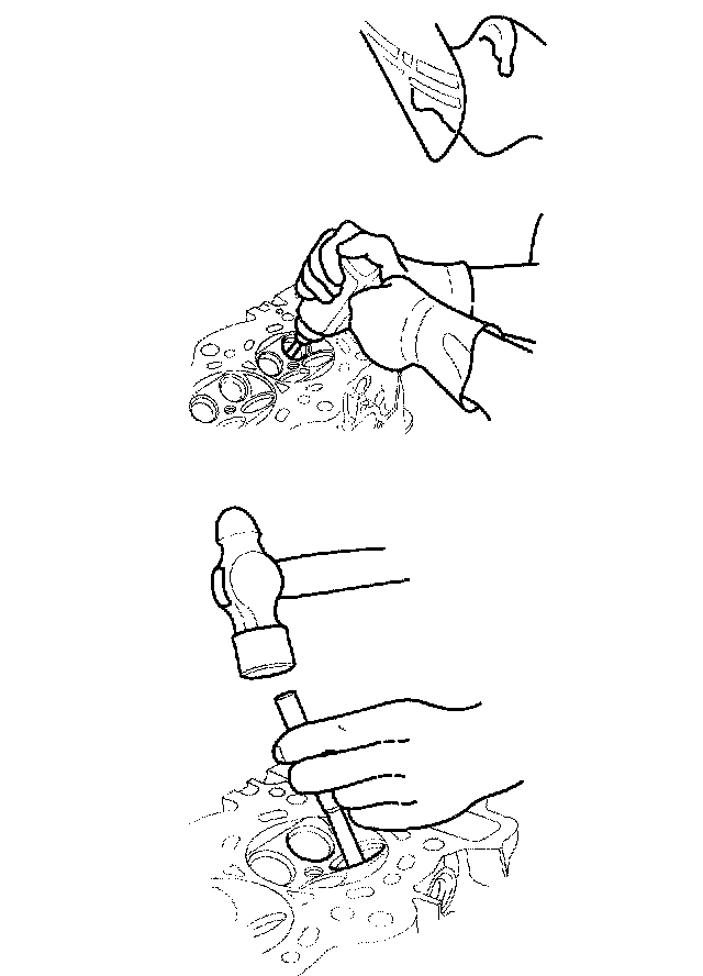 5. Working from the camshaft side, use the driver and an air hammer to drive the guide about 2 mm (0.1 inch) towards the combustion chamber. This will knock off some of the carbon and make removal easier. Hold the air hammer directly in line with the valve guide to prevent damaging the driver. Wear safety goggles or a face shield.