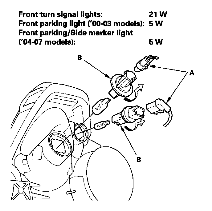 Front Turn Signal Light, Front Parking Light ('00-03 models), Front Parking/Side Marker Light ('04-07 models)1. Remove the inner fender.