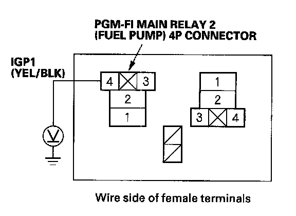 5. Measure voltage between PGM-FI main relay 2 (FUEL PUMP) 4P connector terminal No. 1 and body ground.