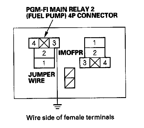 7. Connect PGM-FI main relay 2 (FUEL PUMP) 4P connector terminal No. 3 to body ground with a jumper wire.