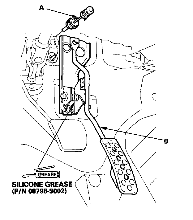 4. Remove the throttle cable (A) from the accelerator pedal (B).