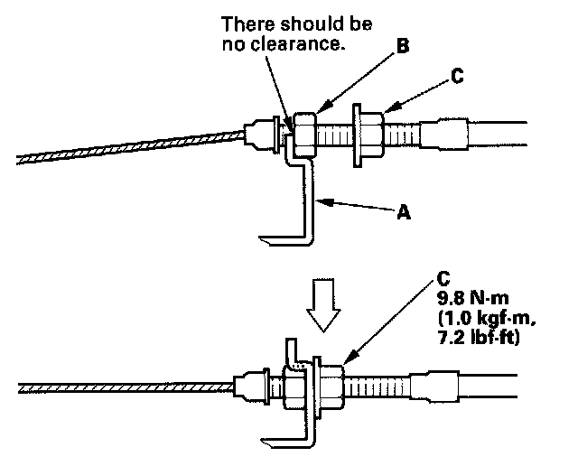 8. Position the adjusting nut on the other side of the bracket, then tighten the locknut (C).