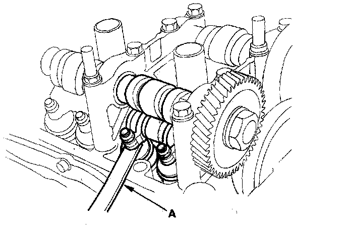 4. Insert the feeler gauge (A) between the adjusting screw and the end of the valve stem and glide it back and forth; you should feel a slight amount of drag.