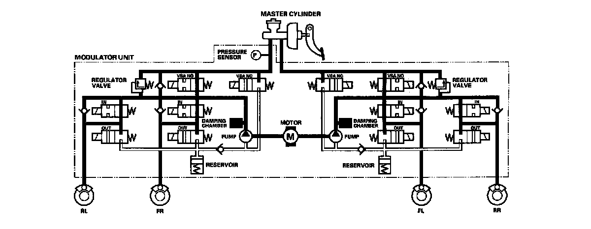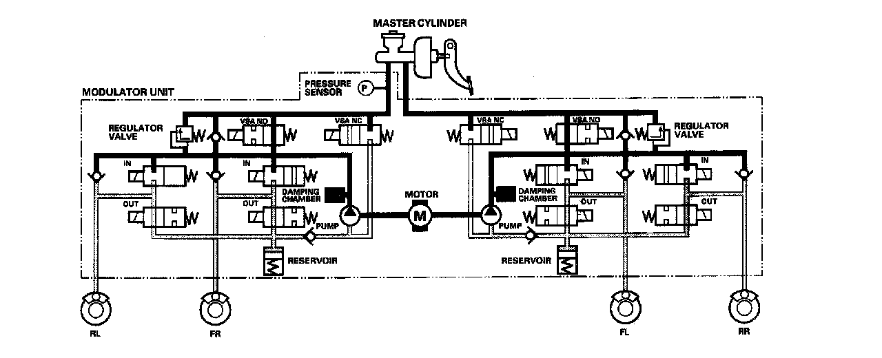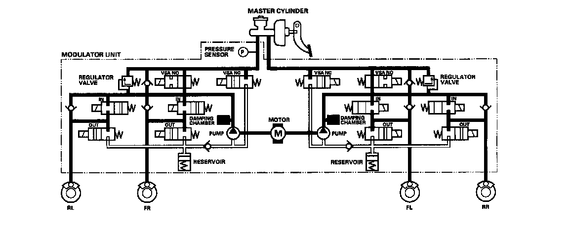 VSA NO valve open, VSA NC valve closed, inlet valve open, outlet valve closed. Master cylinder fluid is pumped out to the caliper.