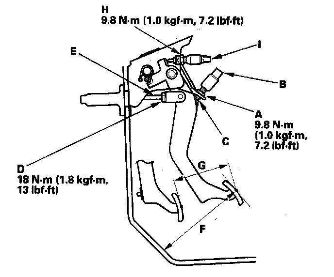 2. Loosen the clutch pushrod locknut (D), and turn the pushrod (E) in or out to get the specified height (F) and stroke (G) at the clutch pedal.