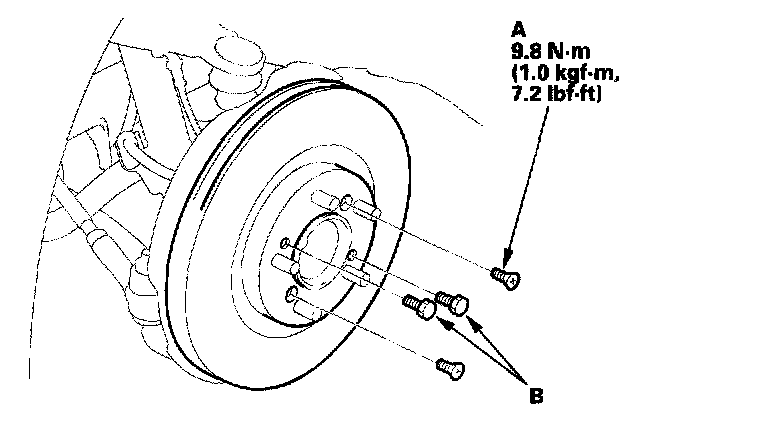 7. Screw two 8 x 1.25 mm bolts (B) into the disc to push it away from the hub. Turn each bolt two turns at a time to prevent cocking the disc excessively.