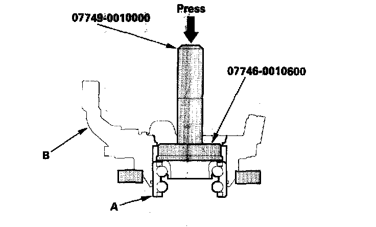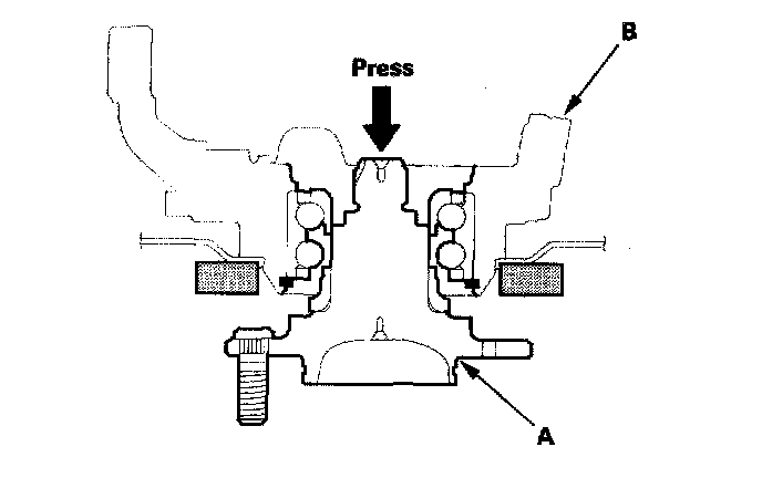 19. Separate the hub (A) from the knuckle (B) using a hydraulic press. Be careful not to deform the splash guard. Hold onto the hub to keep it from failing when pressed clear.