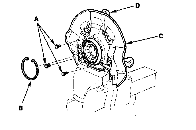 20. Remove the screws (A), snap ring (B), and the splash guard (C) from the knuckle (D).