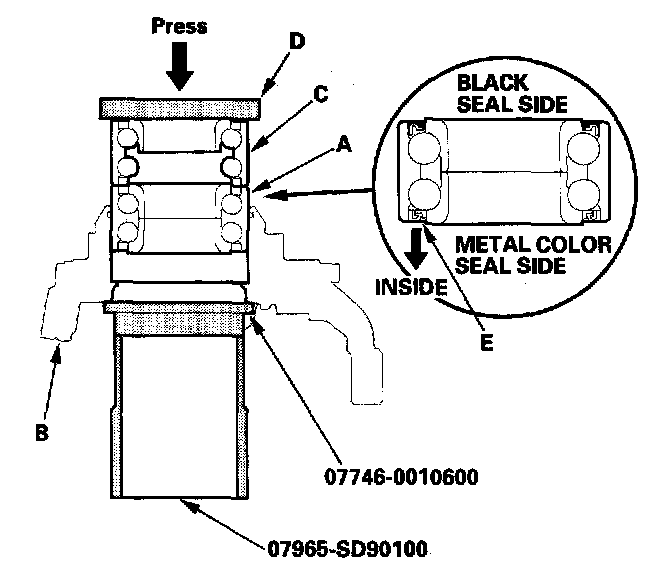 24. Press a new wheel bearing (A) into the knuckle (B) using the old bearing (C), a steel plate (D), the special tools, and a press. Place the wheel bearing on the knuckle with the pack seal side facing (E) (metal color) toward the inside. Be careful not to damage the sleeve of the pack seal.