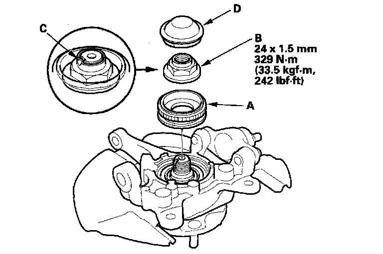 30. Apply a small amount of engine oil to the seating surface of a new spindle nut (B). Install the new nut, and tighten it to the specified torque value. Stake (C) the nut shoulder against the driveshaft with a drift.
