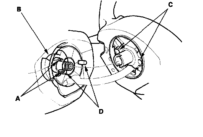 2. Position the two tabs (A) of the turn signal canceling sleeve (B) as shown, and install the steering wheel onto the steering column shaft, making sure the steering wheel hub (C) engages the pins (D) of the cable reel and tabs of the canceling sleeve. Do not tap on the steering wheel or steering column shaft when installing the steering wheel.
