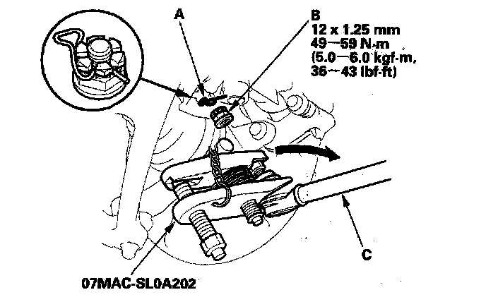 NOTE: Turn the control arm (C) outward to install the ball joint remover.