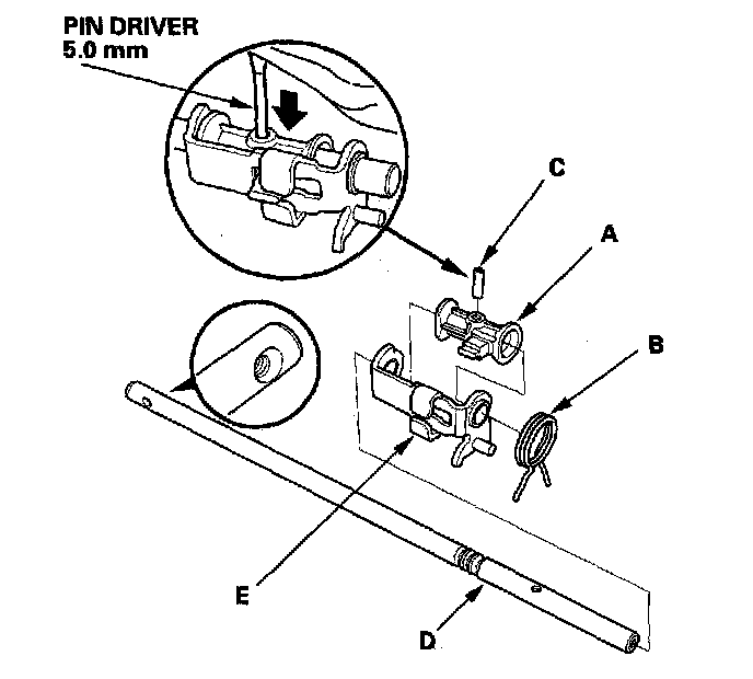2. Remove the 5 x 25 spring pin (C) from shift arm A with a 5 mm pin driver, then remove the shift rod (D).