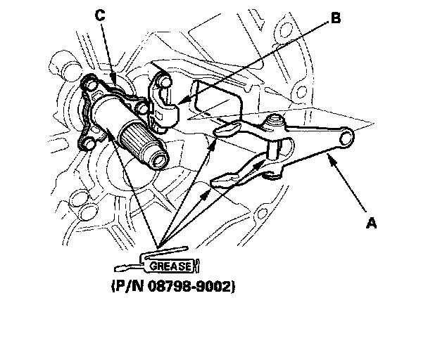 3. Apply super high temp urea grease (P/N 08798-9002) to the release fork (A), the release hanger (B), and the release bearing guide (C). Install the release fork into the opening in the clutch housing.