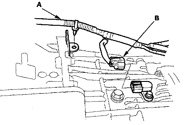 7. Install the wire harness (A) to the transmission, then connect the vehicle speed sensor (VSS) (2000-2005 models) or the output shaft (countershaft) speed sensor (2006 model) connector (B).