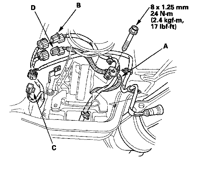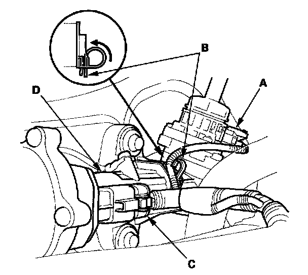 18. Install the wire harness (A) onto the transmission, then connect the primary heated oxygen sensor (primary HO2S) (sensor 1) (2000-2005 models), the air fuel ratio (A/F) sensor (sensor 1) (2006 model) (B), secondary heated oxygen sensor (secondary HO2S) (sensor 2) (C), and the back-up light switch (D) connectors.