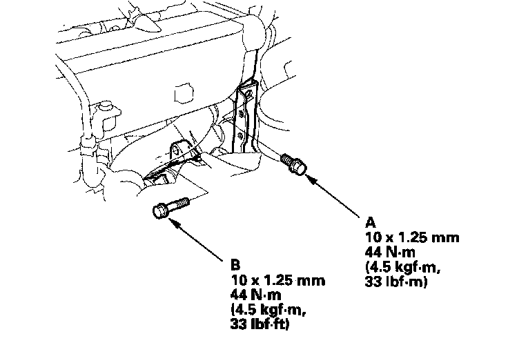 28. 2006 model: Install the upper intake manifold bracket mounting bolt (A) and upper starter motor mounting bolt (B).