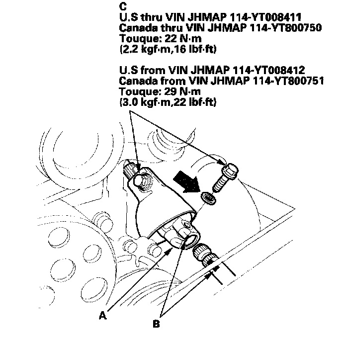 27. 2000-2005 models: Install the upper intake manifold bracket mounting bolt (A) and upper starter motor mounting bolt (B). Connect the hose (C) to the suction valve.