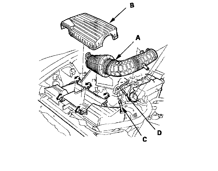 37. 2000-2005 models: Install the air cleaner element assembly (A) and the air cleaner housing cover (B), then connect the air hose (C) and the breather pipe (D).