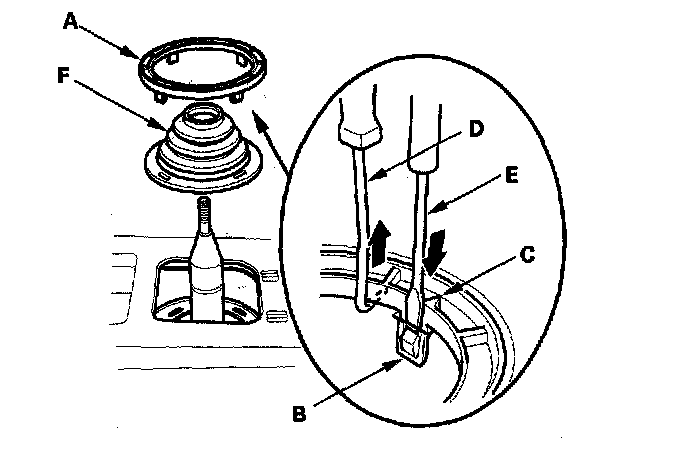4. Remove the boot holder (A) by releasing the lock tabs (B) indicated by the arrowheads (C). Insert a hook-shaped tool (D) underneath the boot holder, and lift slightly while releasing the lock tabs with a flat-tip screwdriver (E).