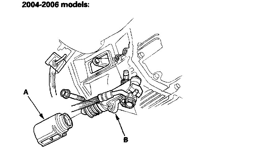 17. 2000-2005 models: Remove the upper starter motor mounting bolt (A) and upper intake manifold bracket mounting bolt (B). Disconnect the hose (C) from the suction valve.