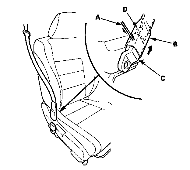 2. 2-door passenger's seat: Carefully insert the tip of a small screwdriver (A) through the hole in the back of the front seat belt lower anchor cover (B) and into the hole in the front seat belt lower anchor (C). Unlock the lower anchor by pushing in on the screwdriver. Remove the screwdriver, and then detach the front seat belt anchor plate (D) and the anchor cover from the lower anchor.