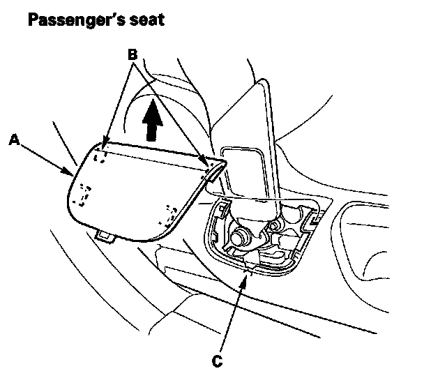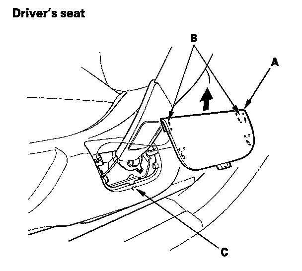 3. 4-door: Slide the front seat all the way forward. Carefully pry up on the bottom of the anchor cover (A) to release the hooks (B) and the tab (C), then remove the cover by pulling it upward.