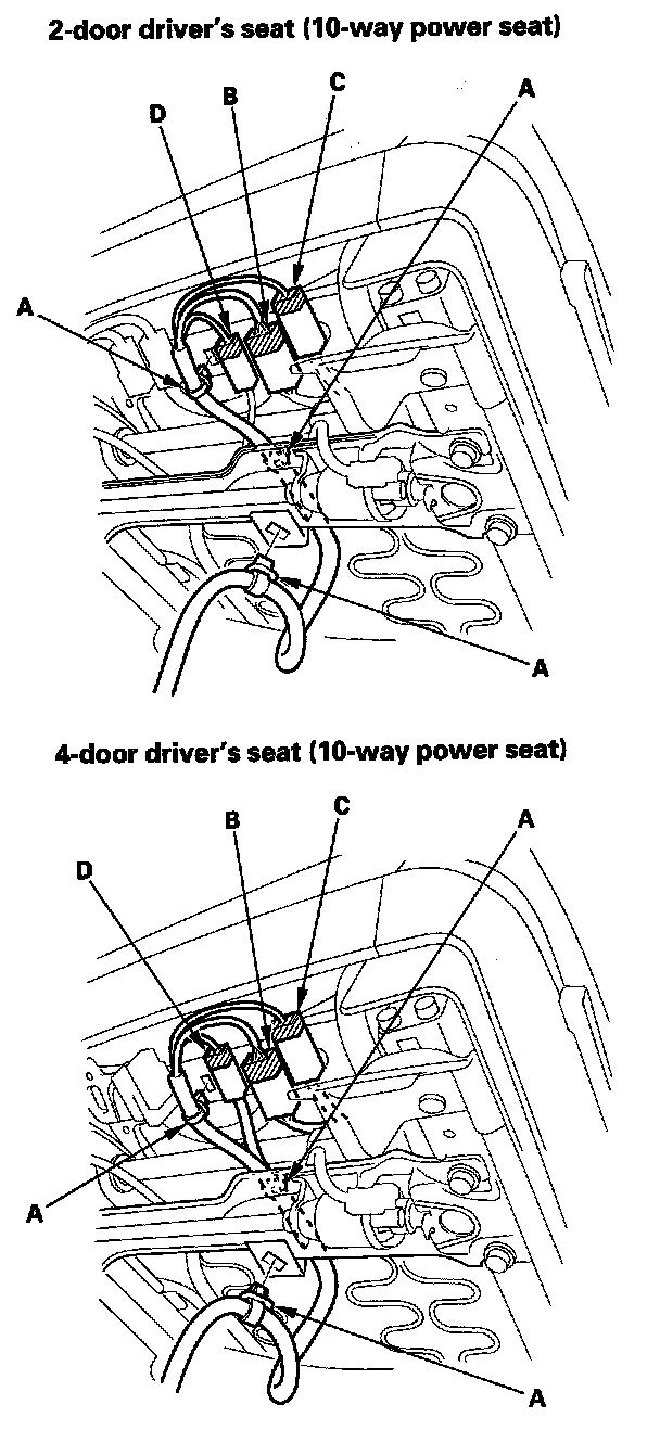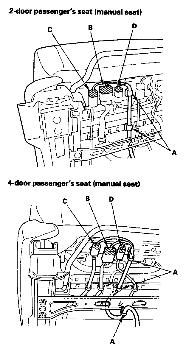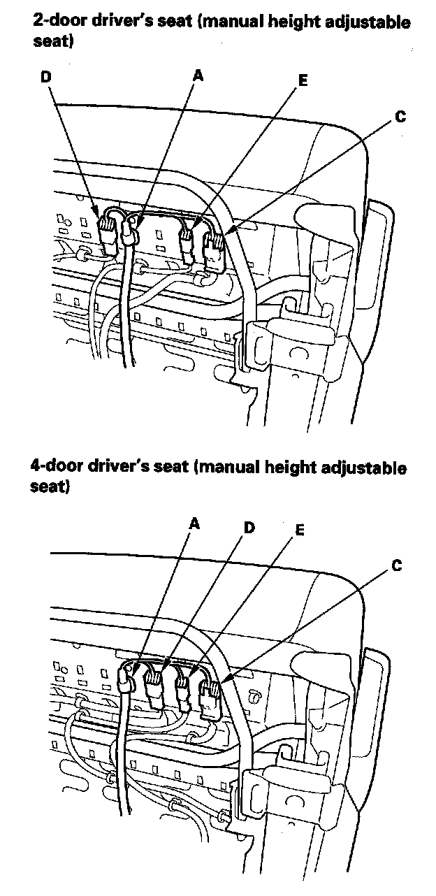 9. Lift up the front seat, then detach the harness clips (A), and disconnect the seat wire harness connector (B), the side airbag connector (C), and the seat belt buckle switch connector (D). Driver's manual height adjustable seat: Disconnect the seat position sensor connector (E).