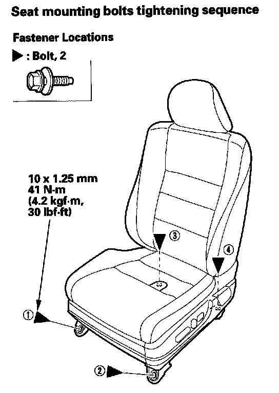 - Tighten the seat mounting bolts to the specified torque in the sequence shown. Slide the seat all the way back and tighten (1) and (2), then slide it forward and tighten (3) and (4). The driver's seat is shown; the passenger's seat is symmetrical.