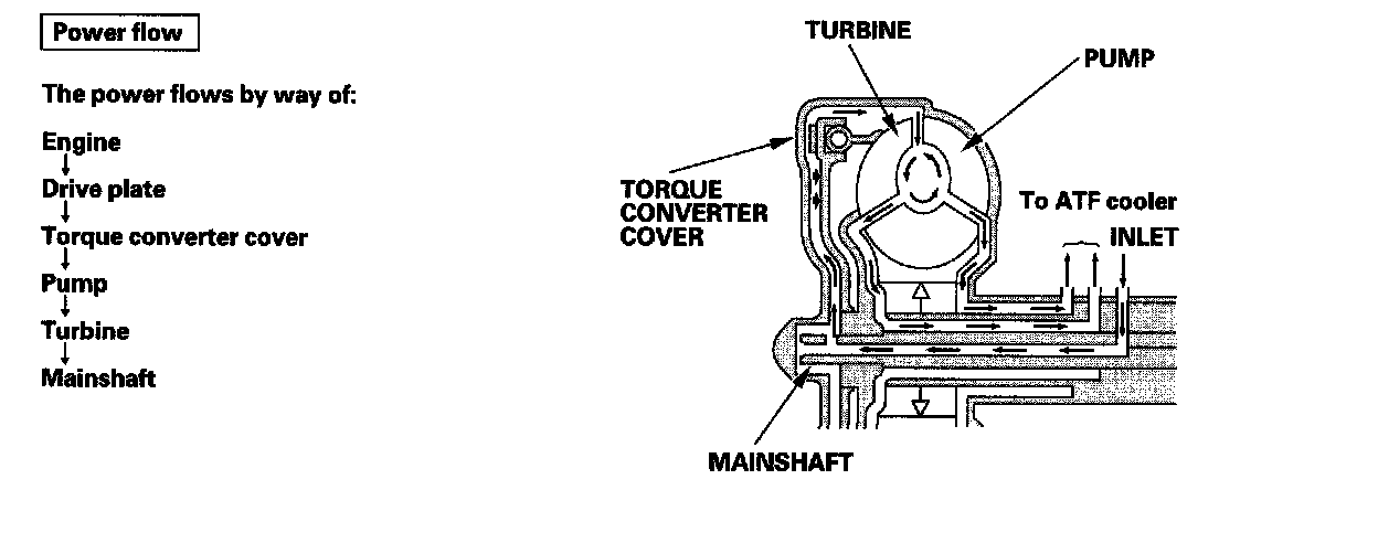 Fluid enters into the chamber between the torque converter cover and the torque converter clutch piston and passes through the torque converter and goes out through the chambers between the turbine and the stator, and between the pump and the stator. As a result, the torque converter clutch piston moves away from the torque converter cover, and the torque converter lock-up clutch is released; the torque converter clutch lock-up is OFF.