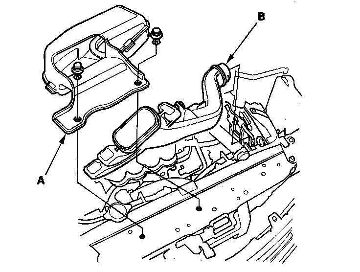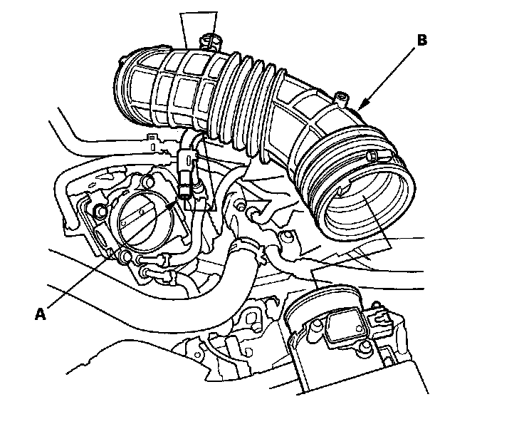 6. Remove the breather pipe (A), then remove the intake air duct (B).