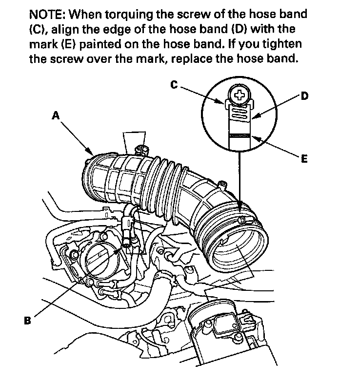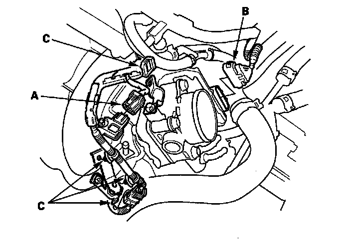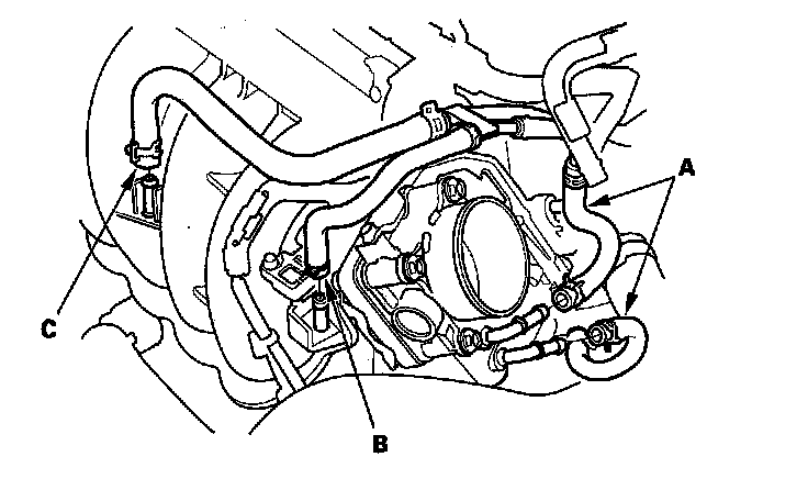 6. Install the evaporative emission (EVAP) canister hose (B) and the brake booster vacuum hose (C).