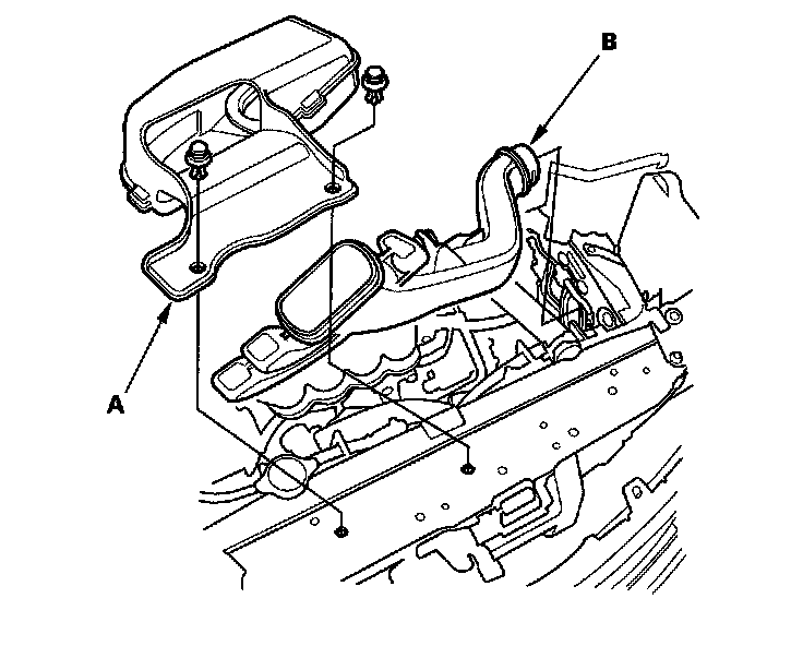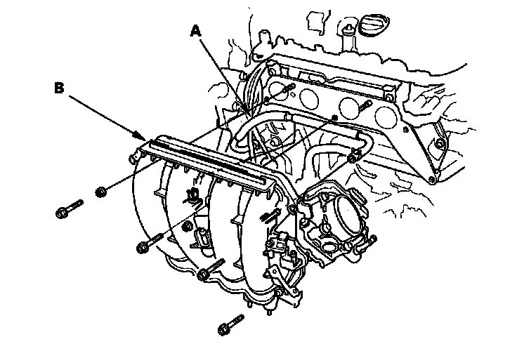 12. Remove the positive crankcase ventilation (PCV) hose (A) from the intake manifold, then remove the intake manifold (B).