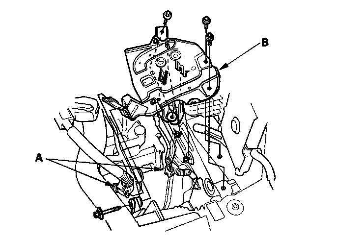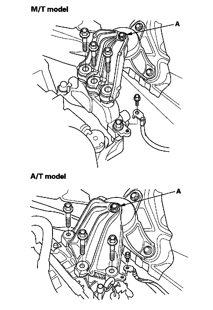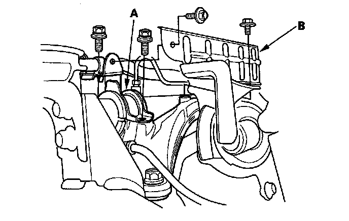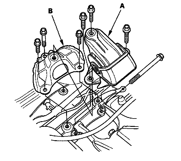 46. A/T model: Remove the rear engine mount (A), then remove the rear engine mount upper bracket (B).
