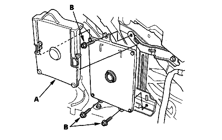 11. Remove the engine control module (ECM)/powertrain control module (PCM) cover (A), then remove the three bolts (B) securing the ECM/PCM.