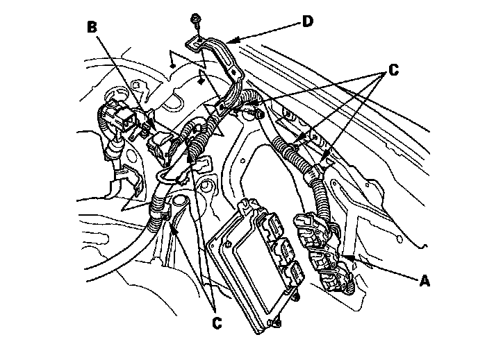 13. Remove the harness clamps (C) and the bracket (D).